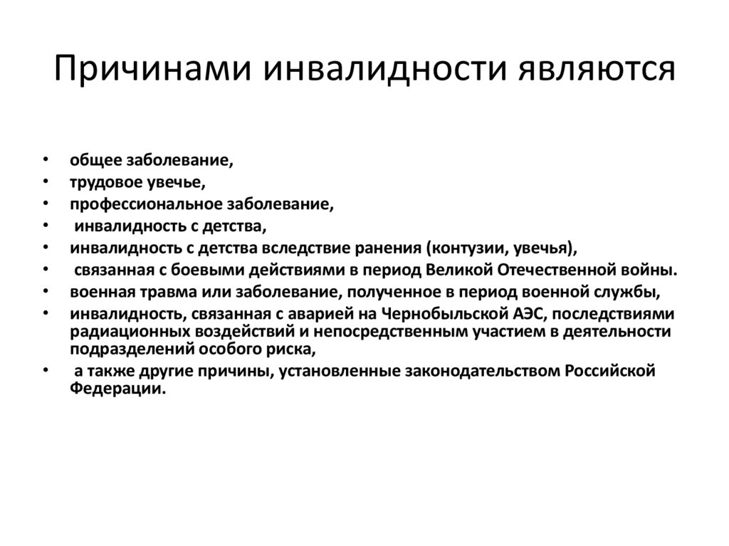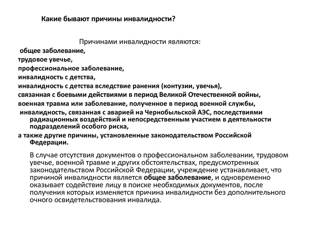 Какие бывают причины инвалидности?Причинами инвалидности являются: