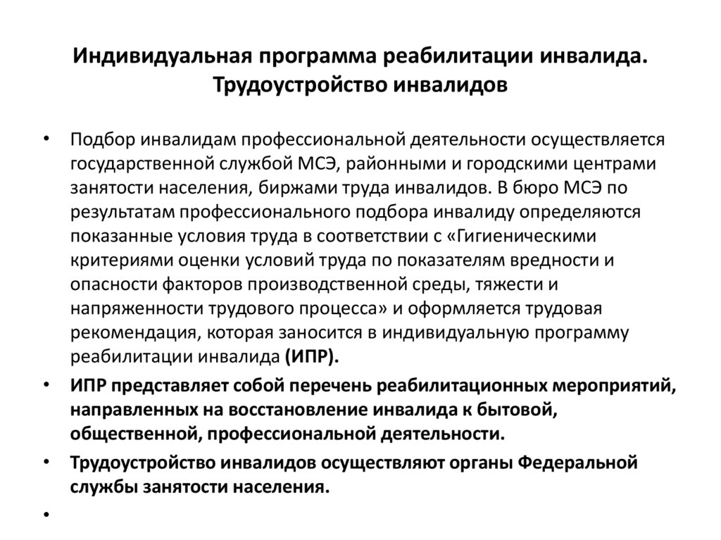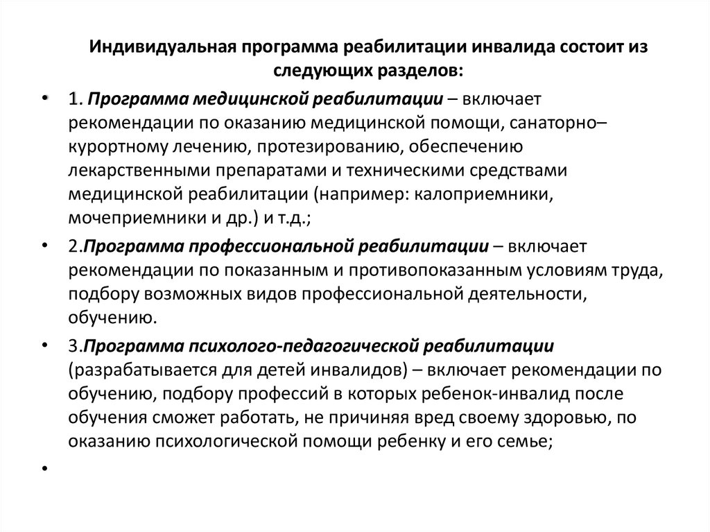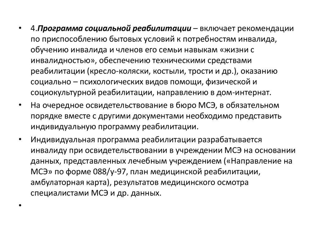 • 4.Программа социальной реабилитации – включает рекомендациипо приспособлению бытовых условий к потребностям инвалида,