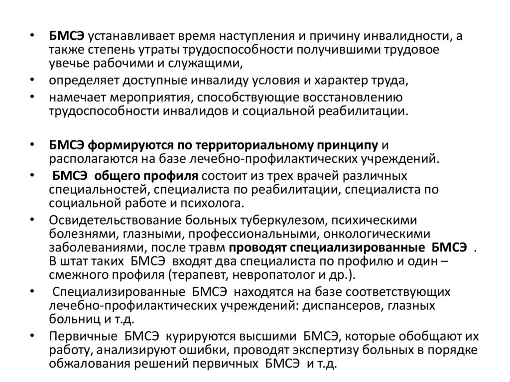 • БМСЭ устанавливает время наступления и причину инвалидности, атакже степень утраты трудоспособности получившими трудовое