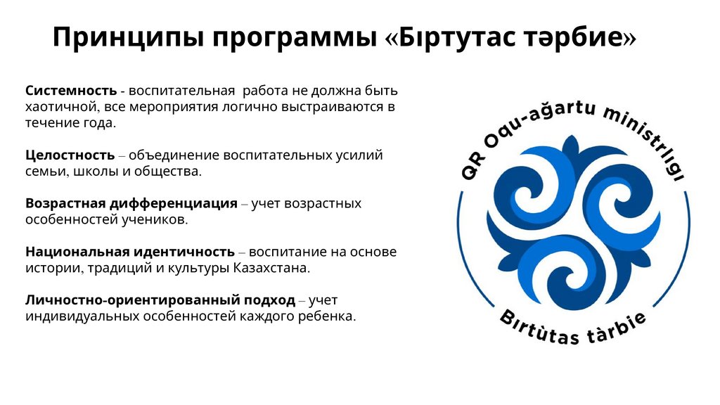 Принципы программы «Біртутас тәрбие»Системность - воспитательная работа не должна быть