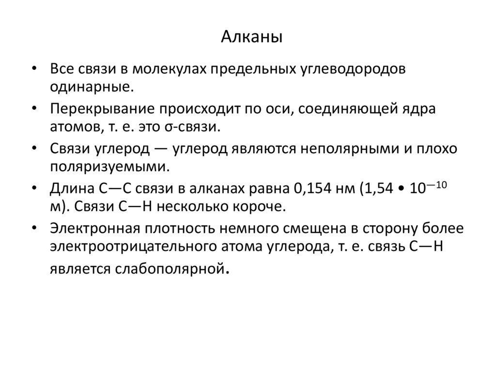 • Длина С—С связи в алканах равна 0,154 нм (1,54 • 10—10