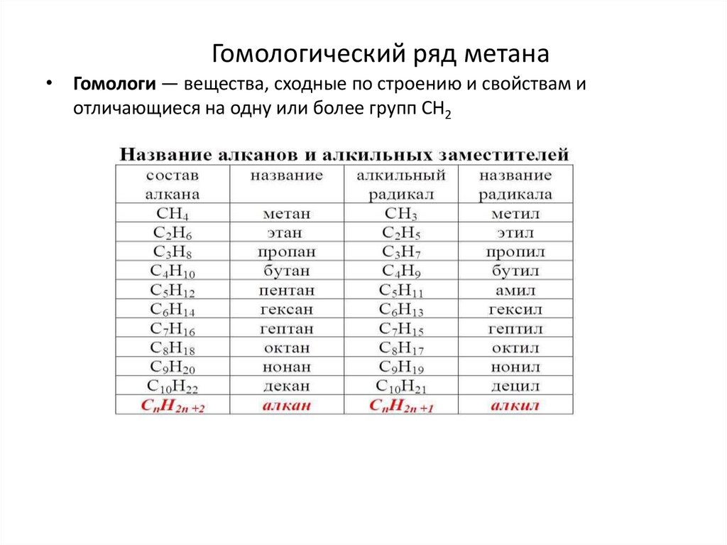 Гомологический ряд метана• Гомологи — вещества, сходные по строению и свойствам и