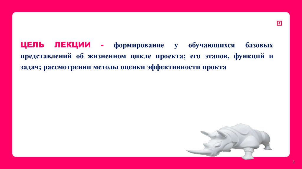 ЦЕЛЬ ЛЕКЦИИ - формирование у обучающихся базовыхпредставлений об жизненном цикле проекта; его этапов, функций и