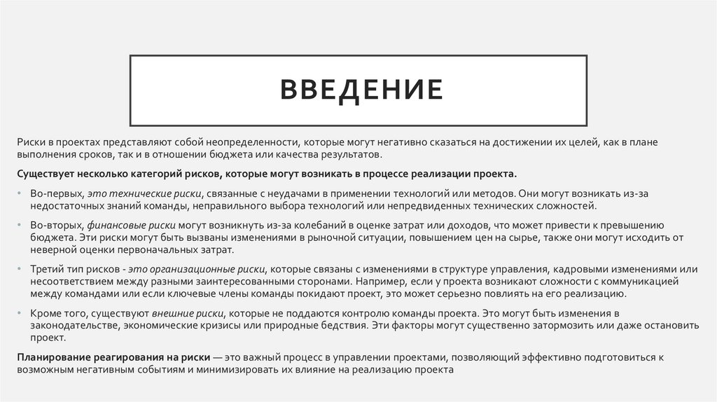 ВВЕДЕНИЕРиски в проектах представляют собой неопределенности, которые могут негативно сказаться на достижении их целей, как в плане
