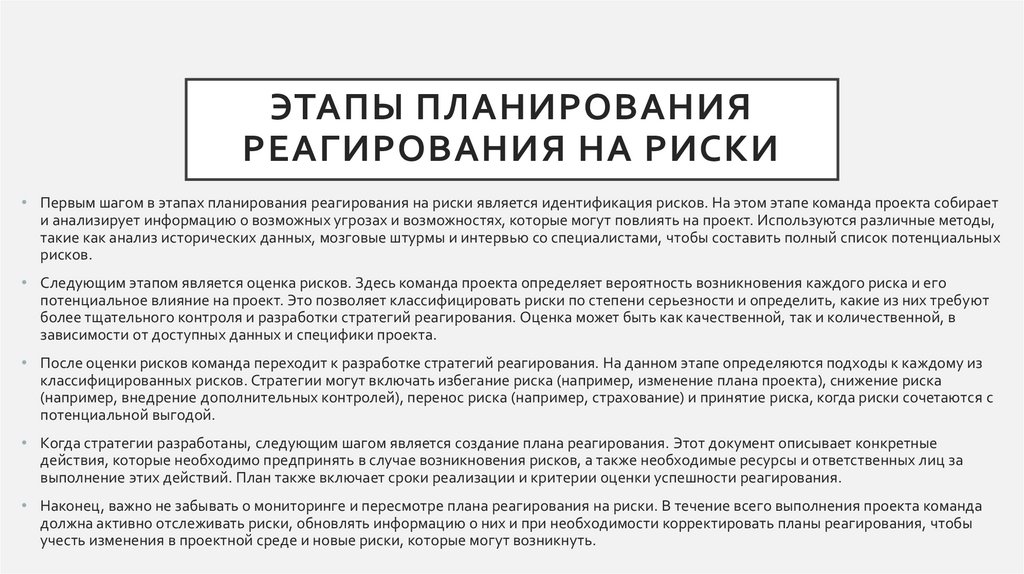 • Наконец, важно не забывать о мониторинге и пересмотре плана реагирования на риски. В течение всего выполнения проекта команда