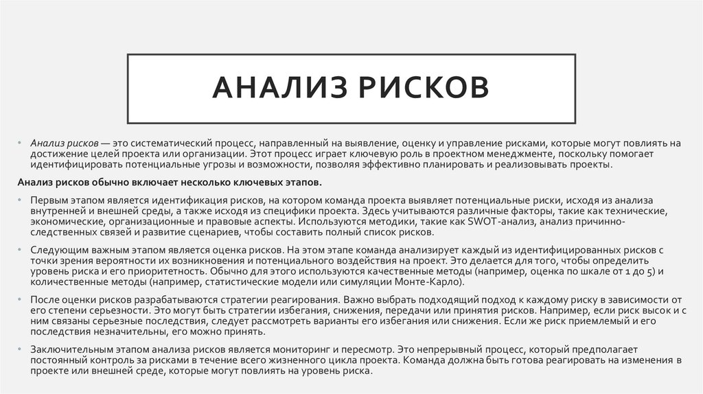 АНАЛИЗ РИСКОВ• Анализ рисков — это систематический процесс, направленный на выявление, оценку и управление рисками, которые могут повлиять на