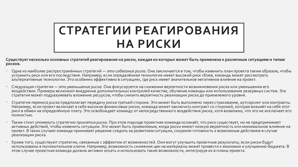 Существует несколько основных стратегий реагирования на риски, каждая из которых может быть применена к различным ситуациям и типам