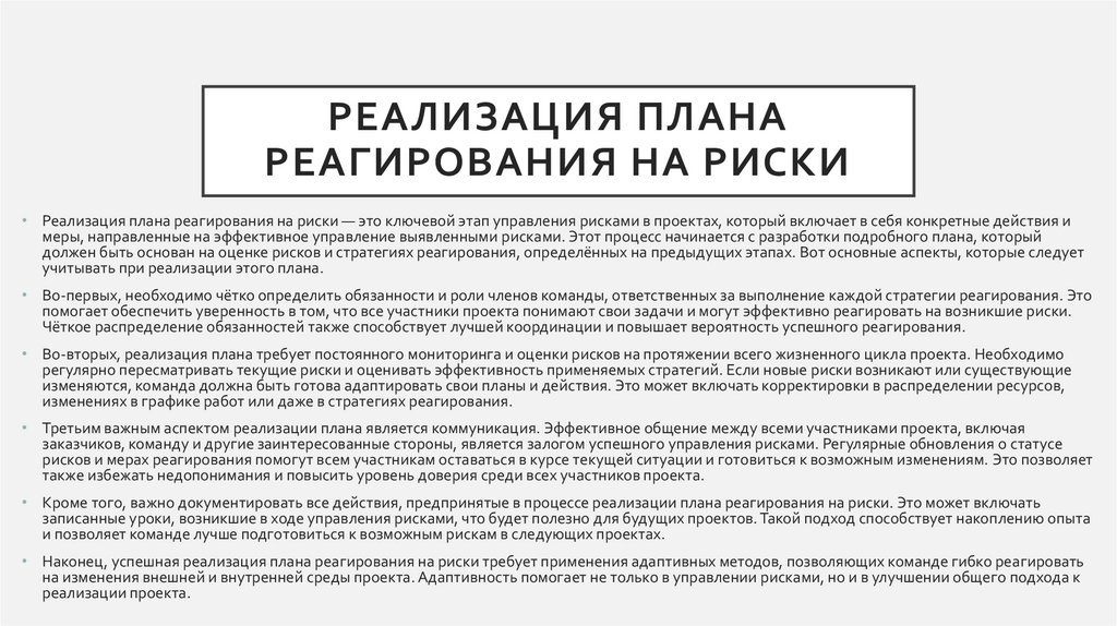 • Наконец, успешная реализация плана реагирования на риски требует применения адаптивных методов, позволяющих команде гибко реагировать