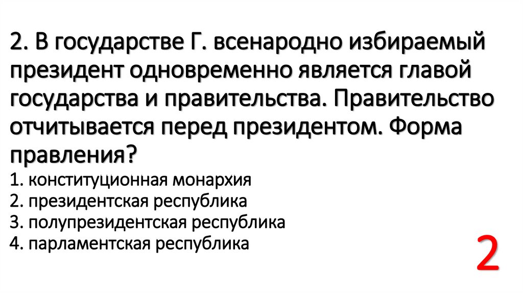 2. В государстве Г. всенародно избираемыйпрезидент одновременно является главой