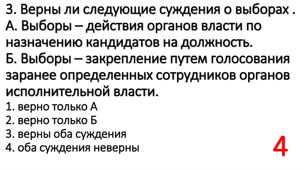 3. Верны ли следующие суждения о выборах .А. Выборы – действия органов власти по