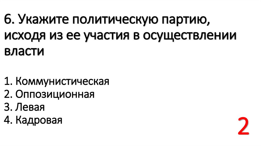 6. Укажите политическую партию,исходя из ее участия в осуществлении