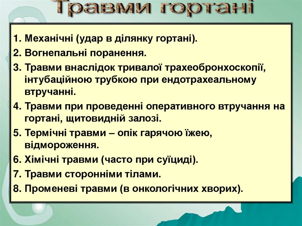 1. Механічні (удар в ділянку гортані).2. Вогнепальні поранення.
