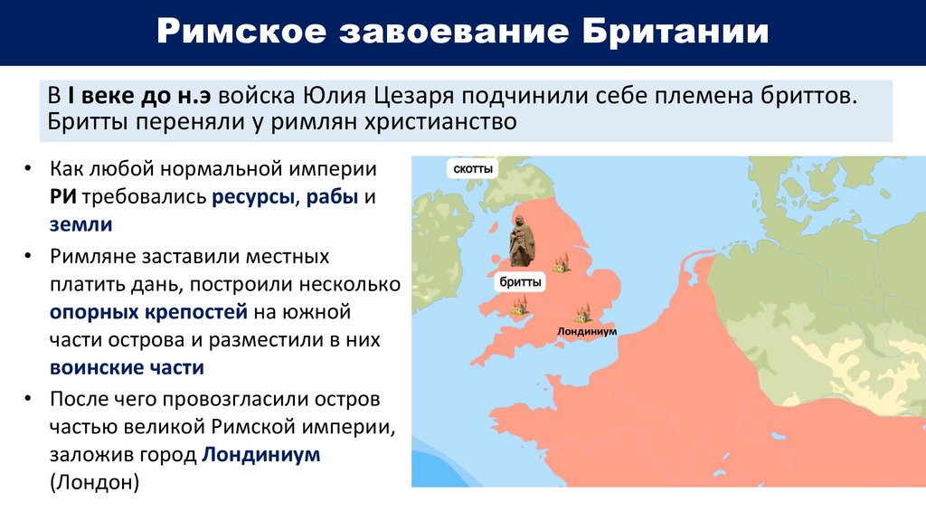 Римское завоевание БританииВ I веке до н.э войска Юлия Цезаря подчинили себе племена бриттов.