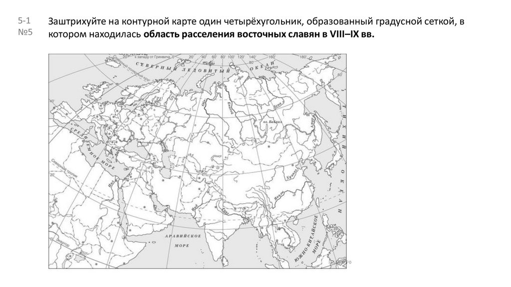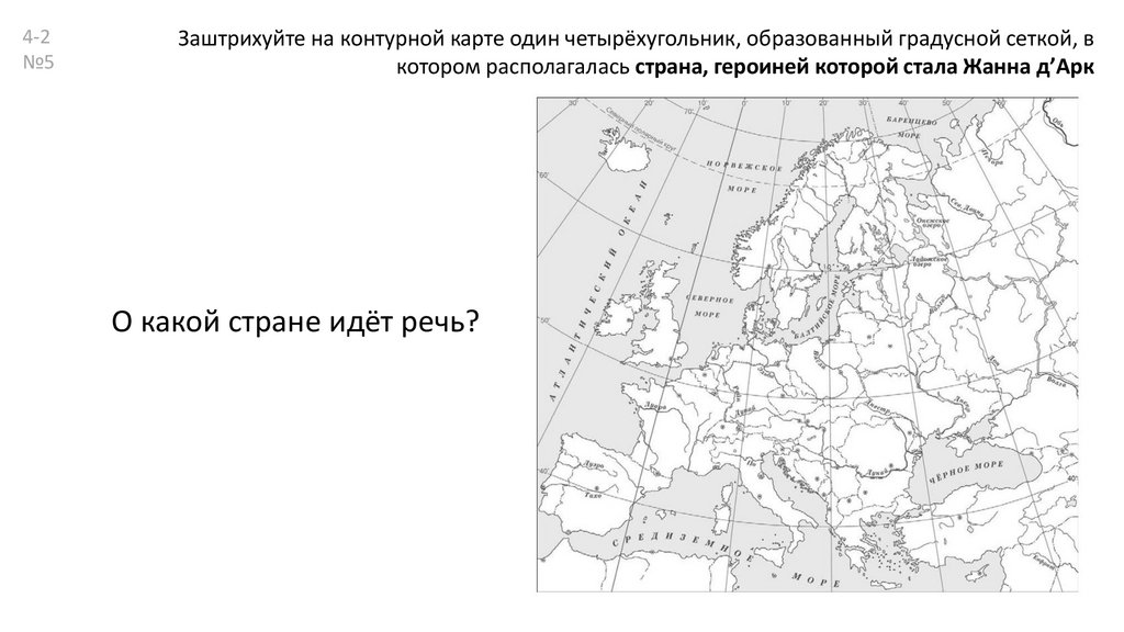 Заштрихуйте на контурной карте один четырёхугольник, образованный градусной сеткой, в