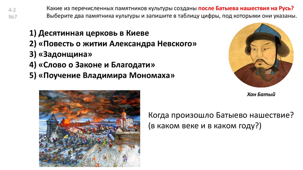 Какие из перечисленных памятников культуры созданы после Батыева нашествия на Русь?