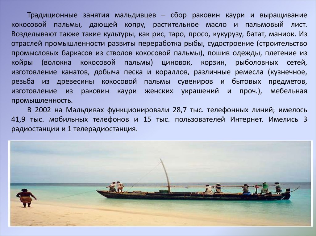Традиционные занятия мальдивцев – сбор раковин каури и выращиваниекокосовой пальмы, дающей копру, растительное масло и пальмовый лист.
