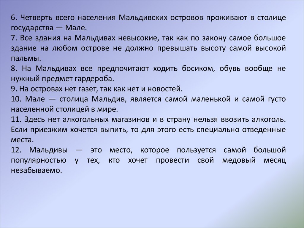 6. Четверть всего населения Мальдивских островов проживают в столицегосударства — Мале.