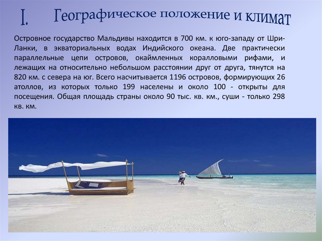 Островное государство Мальдивы находится в 700 км. к юго-западу от ШриЛанки, в экваториальных водах Индийского океана. Две практическипараллельные цепи островов, окаймленных коралловыми рифами, и