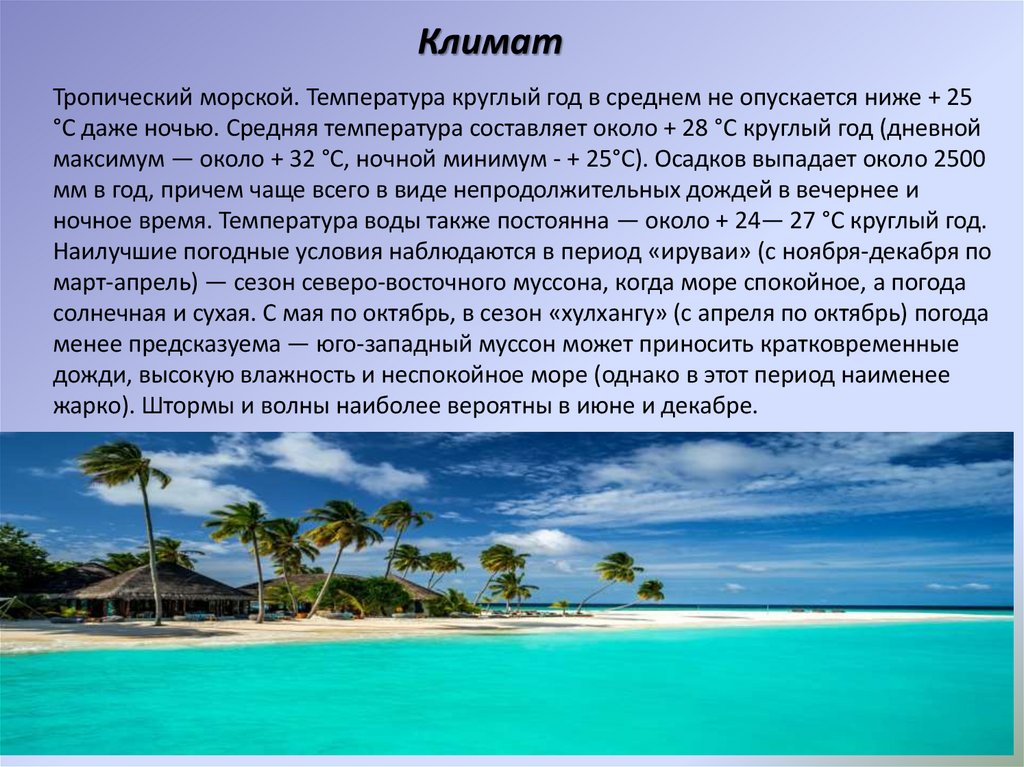 КлиматТропический морской. Температура круглый год в среднем не опускается ниже + 25