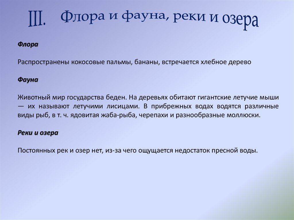 ФлораРаспространены кокосовые пальмы, бананы, встречается хлебное дерево