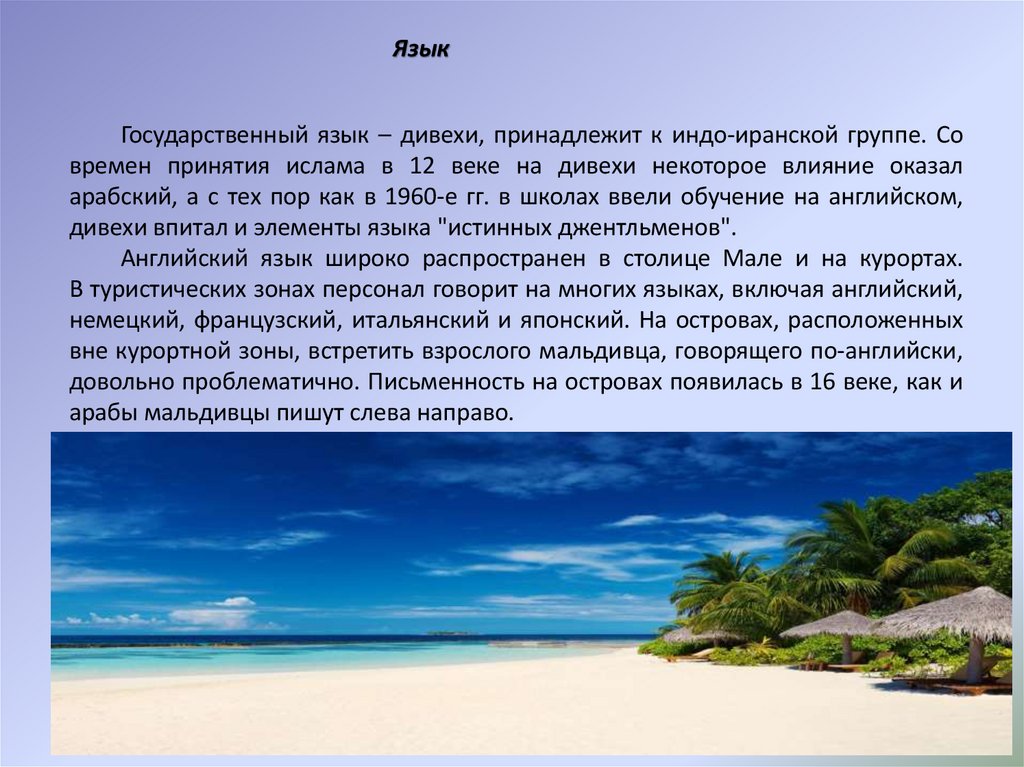 ЯзыкГосударственный язык – дивехи, принадлежит к индо-иранской группе. Со