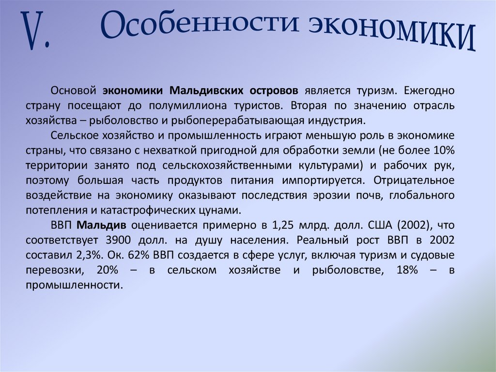Основой экономики Мальдивских островов является туризм. Ежегоднострану посещают до полумиллиона туристов. Вторая по значению отрасль