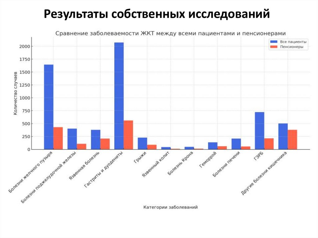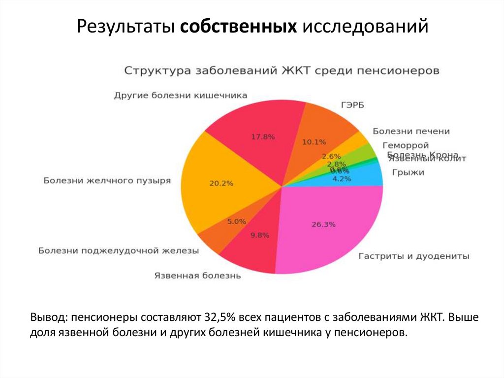 Результаты собственных исследованийВывод: пенсионеры составляют 32,5% всех пациентов с заболеваниями ЖКТ. Выше