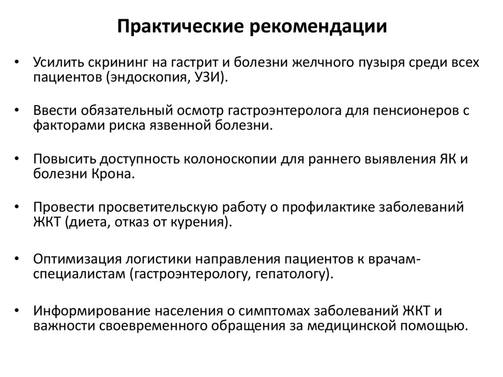 Практические рекомендации• Усилить скрининг на гастрит и болезни желчного пузыря среди всех