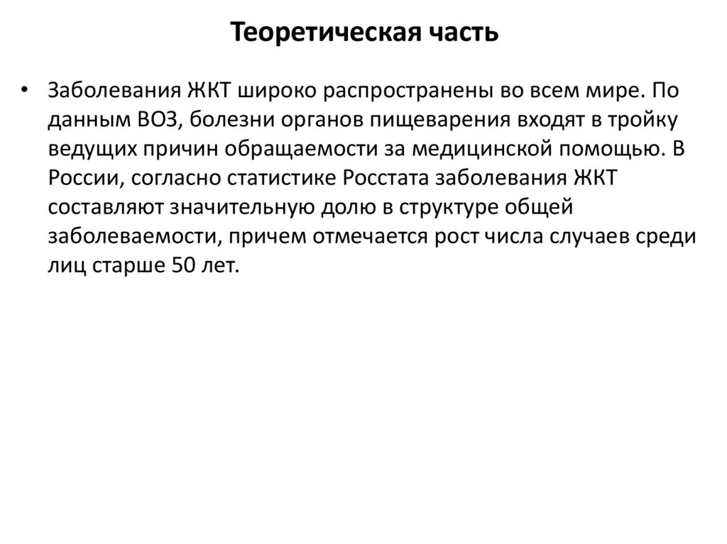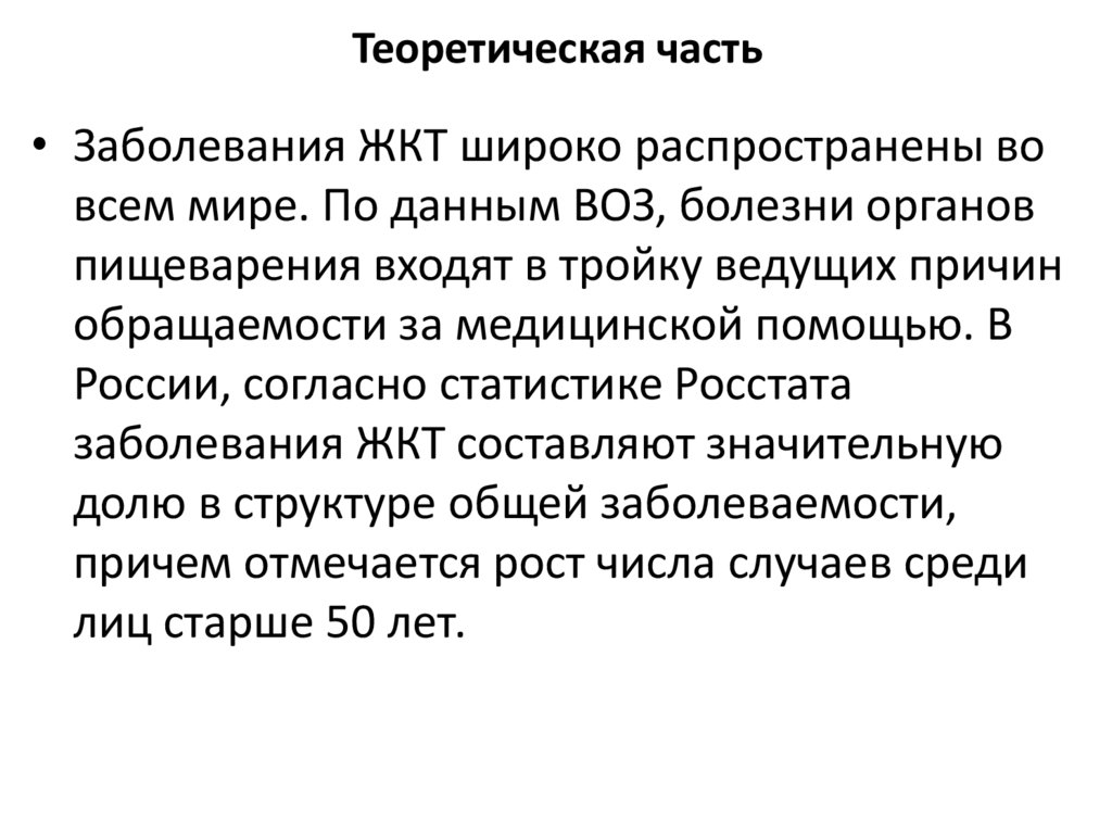 Теоретическая часть• Заболевания ЖКТ широко распространены во