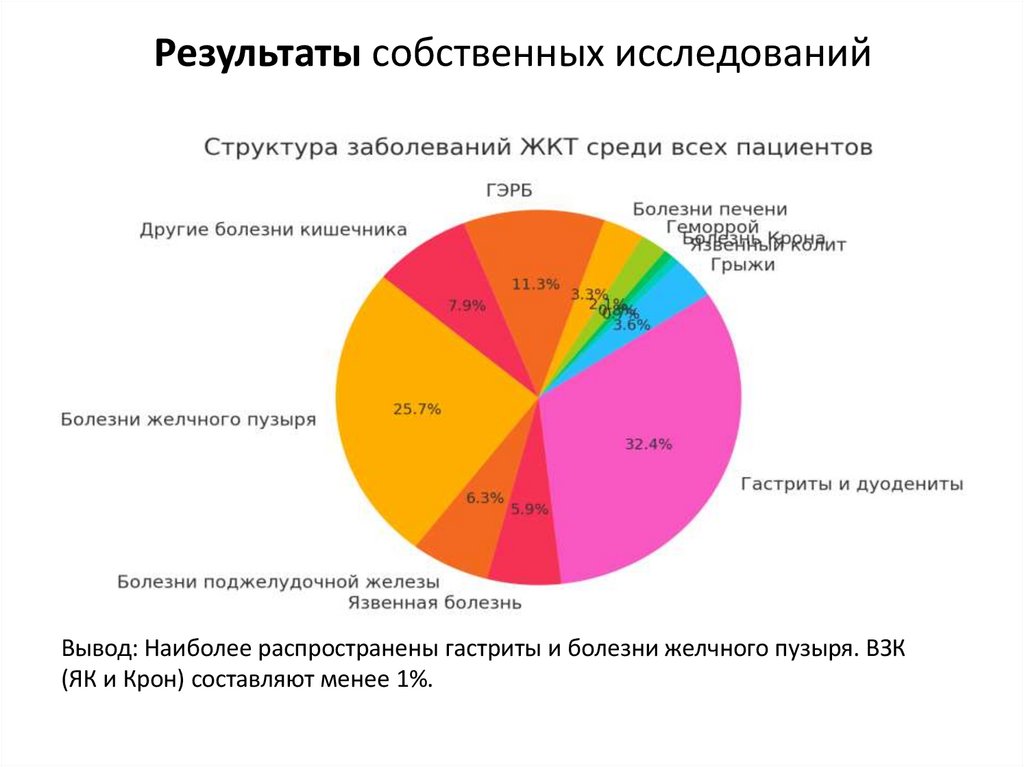 Результаты собственных исследованийВывод: Наиболее распространены гастриты и болезни желчного пузыря. ВЗК