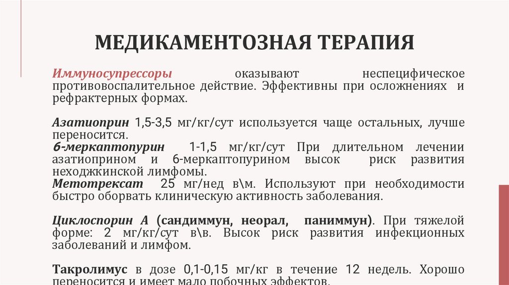 Азатиоприн 1,5-3,5 мг/кг/сут используется чаще остальных, лучше