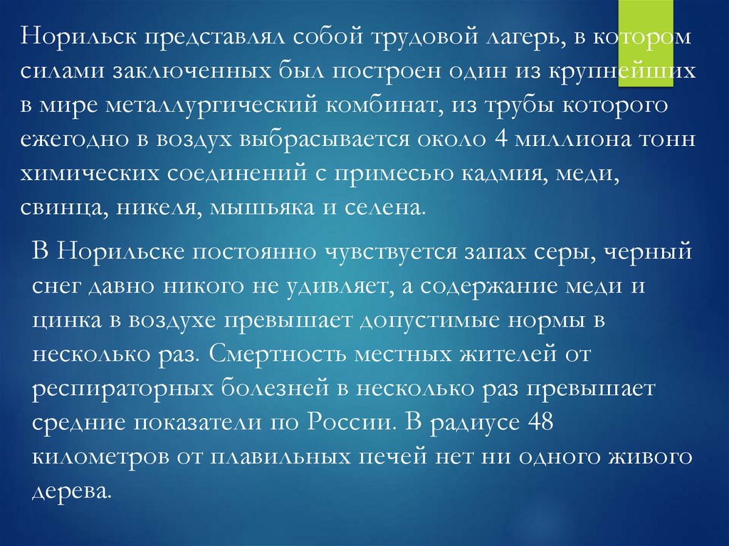 Норильск представлял собой трудовой лагерь, в которомсилами заключенных был построен один из крупнейших