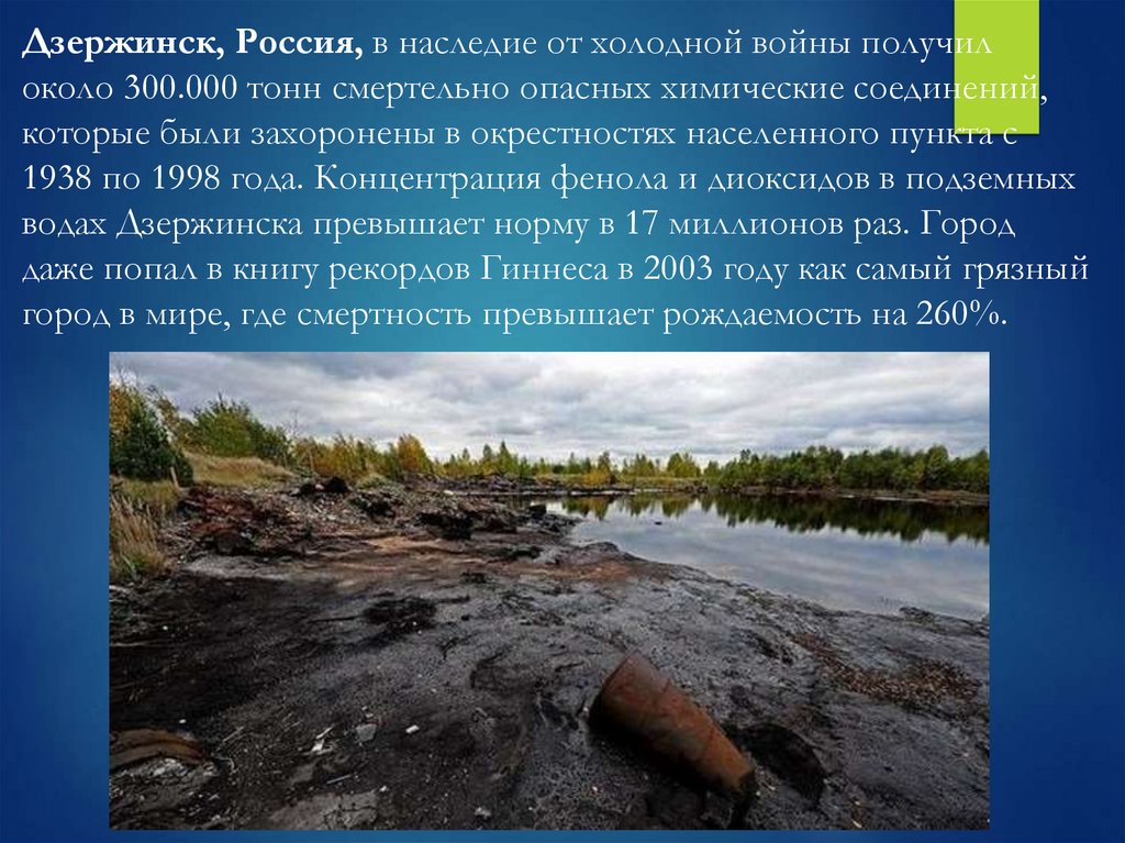 Дзержинск, Россия, в наследие от холодной войны получилоколо 300.000 тонн смертельно опасных химические соединений,