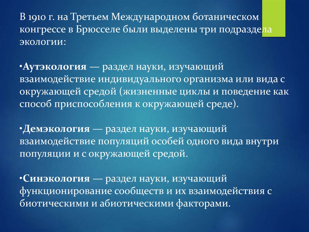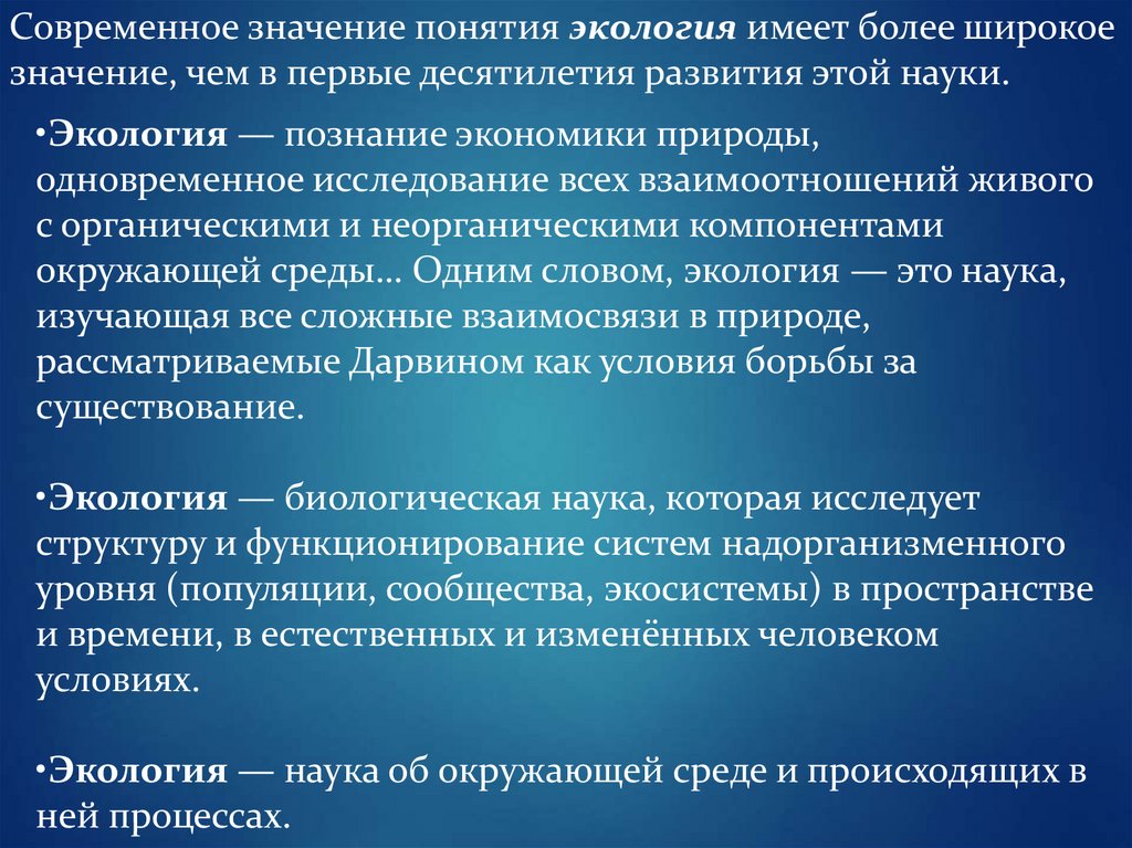 Современное значение понятия экология имеет более широкоезначение, чем в первые десятилетия развития этой науки.