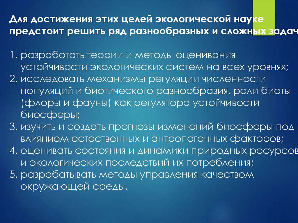 Для достижения этих целей экологической наукепредстоит решить ряд разнообразных и сложных задач