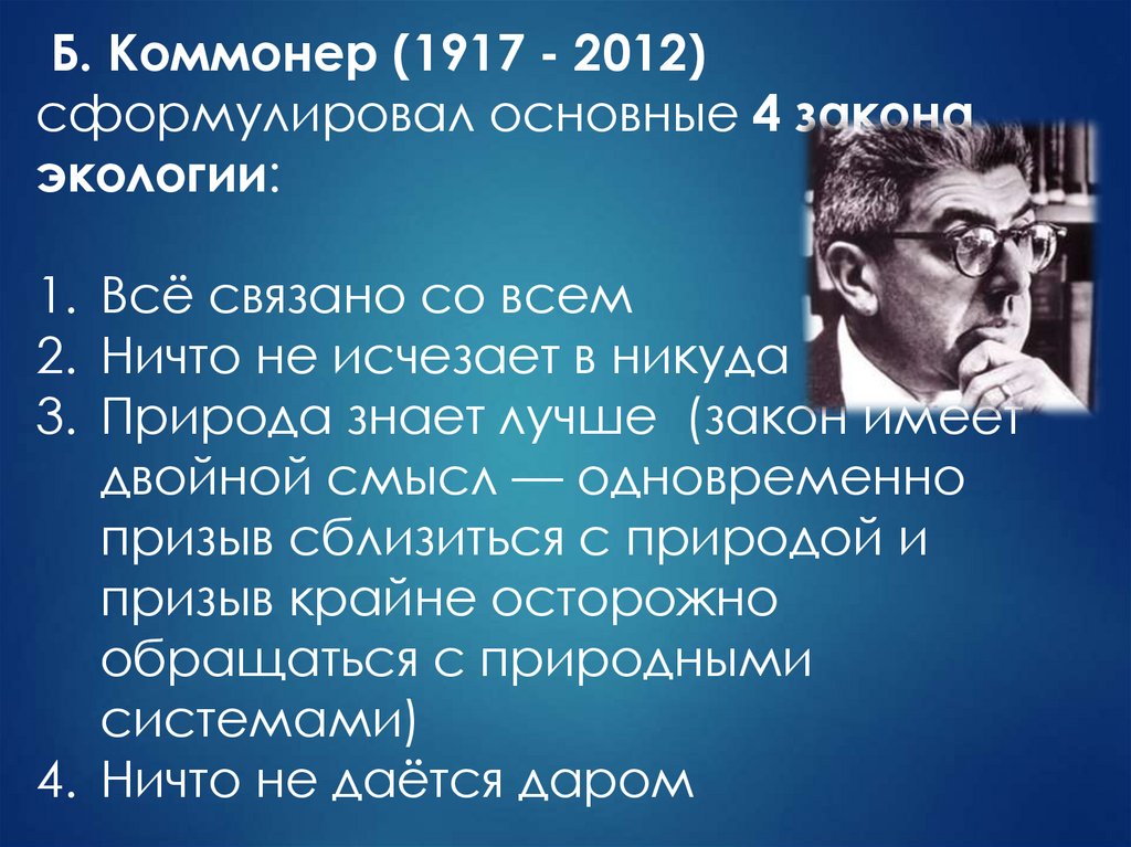 Б. Коммонер (1917 - 2012)сформулировал основные 4 закона