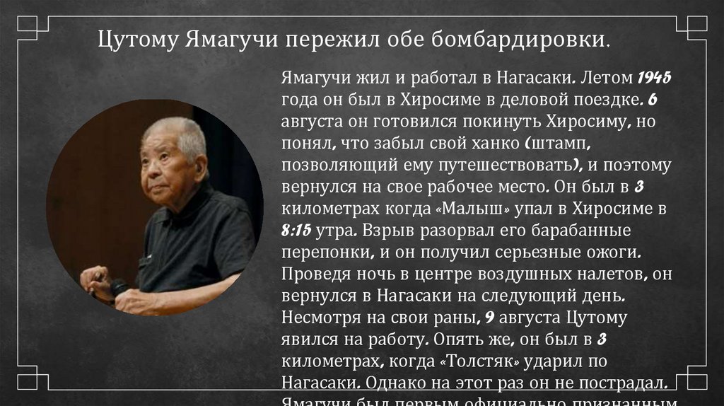 Цутому Ямагучи пережил обе бомбардировки.Ямагучи жил и работал в Нагасаки. Летом 1945