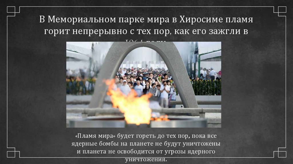 В Мемориальном парке мира в Хиросиме пламягорит непрерывно с тех пор, как его зажгли в
