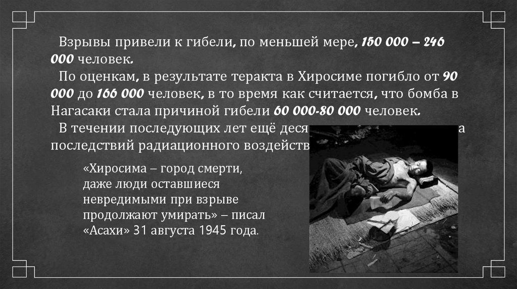 Взрывы привели к гибели, по меньшей мере, 150 000 – 246000 человек.