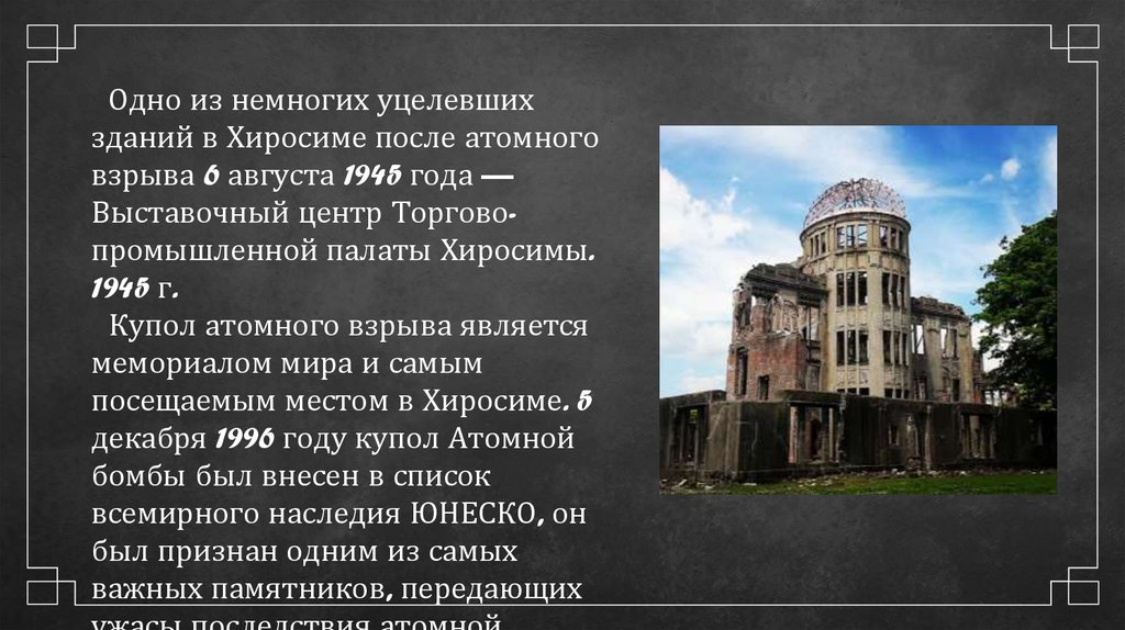 Одно из немногих уцелевшихзданий в Хиросиме после атомного