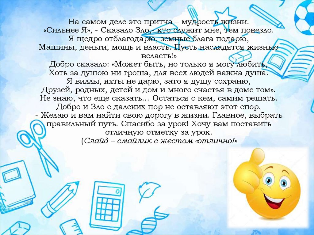 На самом деле это притча – мудрость жизни.«Сильнее Я», - Сказало Зло,- кто служит мне, тем повезло.