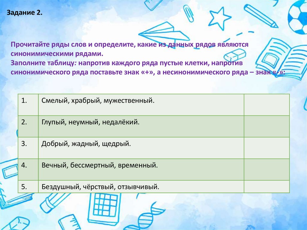 синонимического ряда поставьте знак «+», а несинонимического ряда – знак «-»: