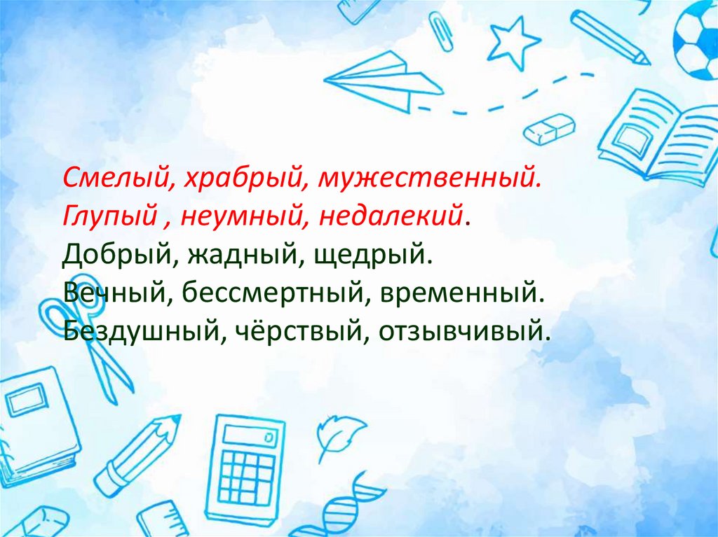 Смелый, храбрый, мужественный.Глупый , неумный, недалекий.