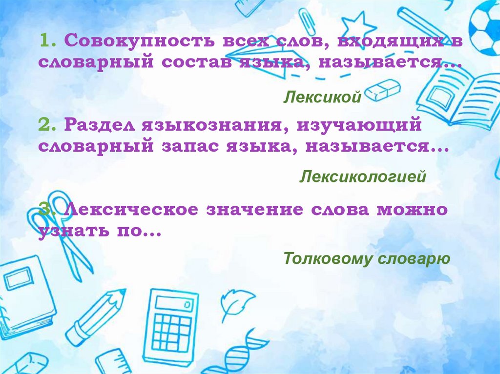 1. Совокупность всех слов, входящих всловарный состав языка, называется…