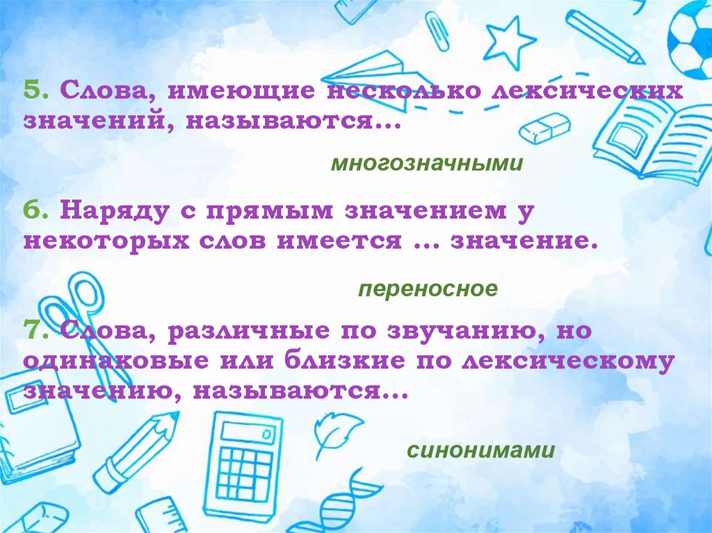 5. Слова, имеющие несколько лексическихзначений, называются…