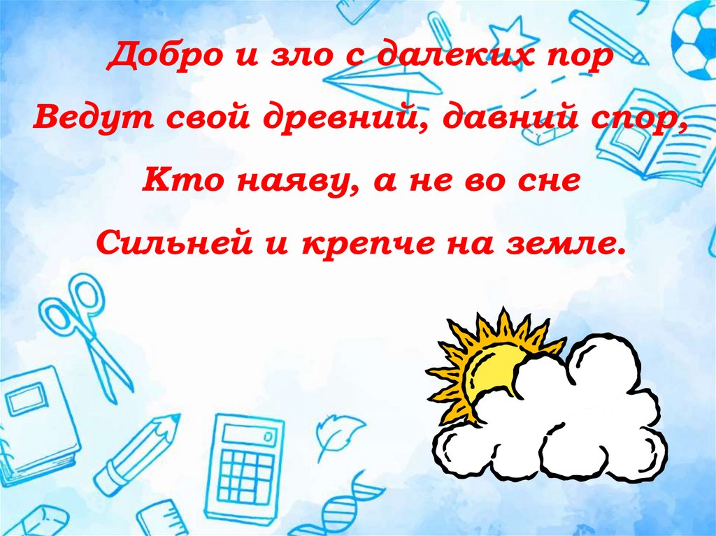 Добро и зло с далеких порВедут свой древний, давний спор,