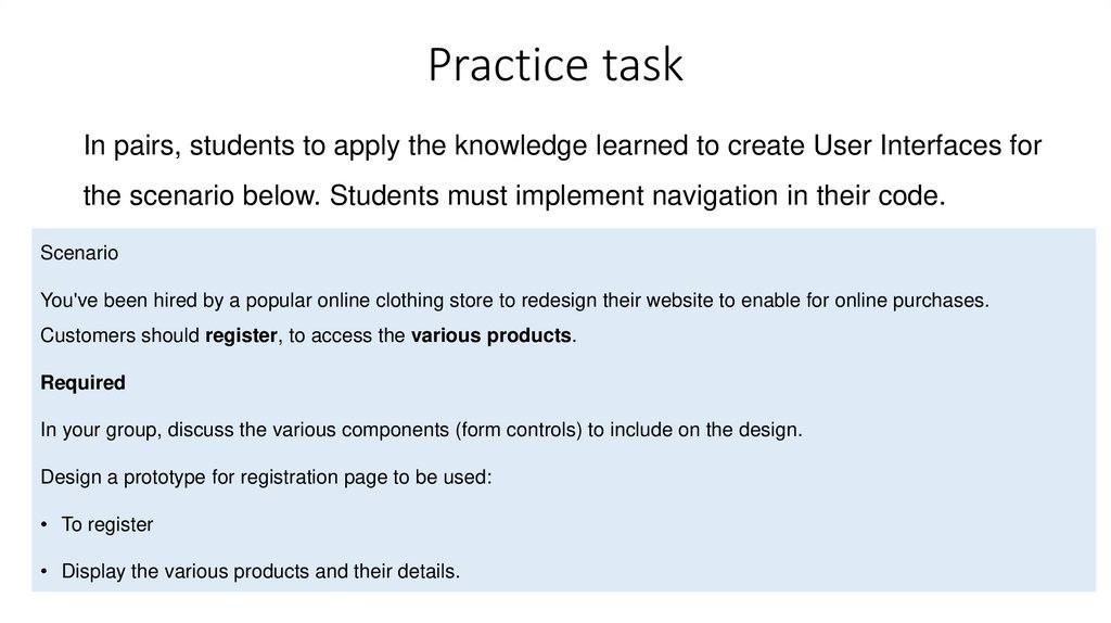 Practice taskIn pairs, students to apply the knowledge learned to create User Interfaces for