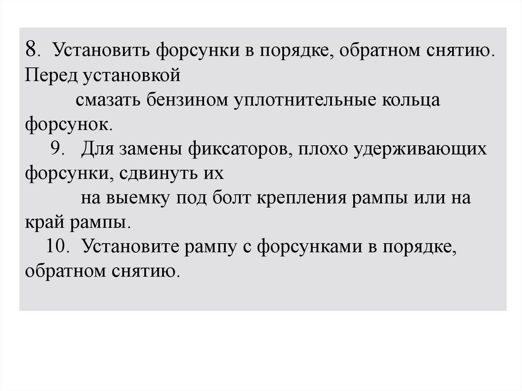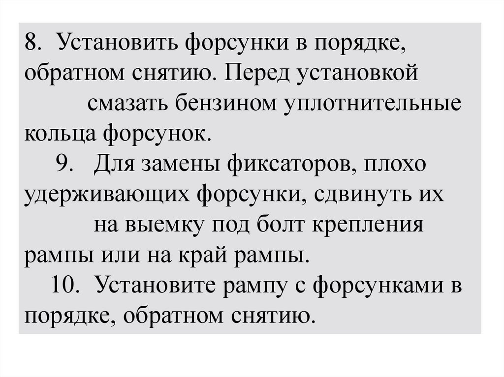 8. Установить форсунки в порядке, обратном снятию.Перед установкой