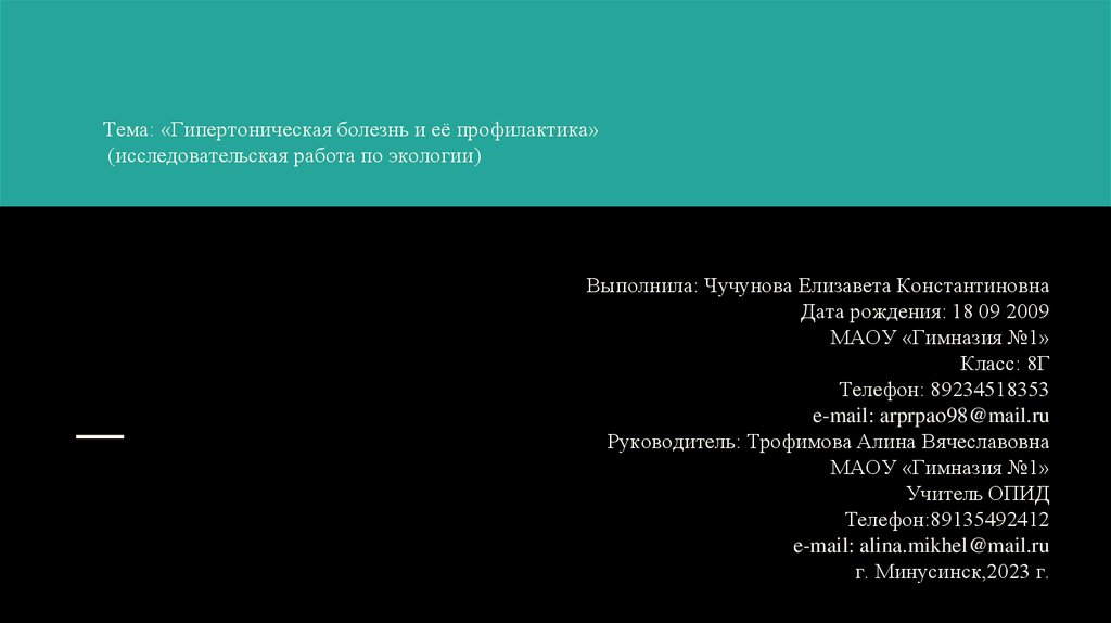 Тема: «Гипертоническая болезнь и её профилактика»(исследовательская работа по экологии)