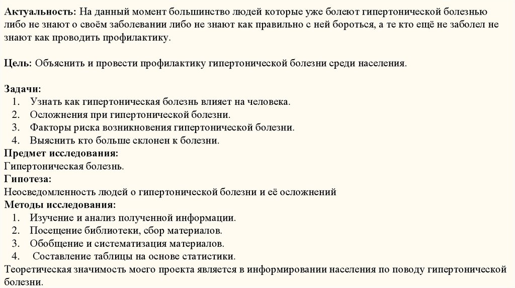 Теоретическая значимость моего проекта является в информировании населения по поводу гипертонической